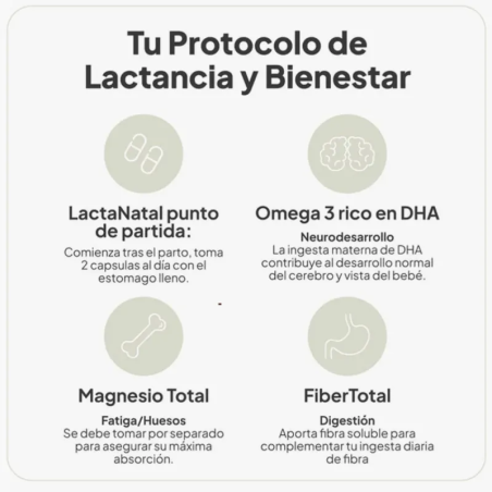 Se recomienda tomar 2 cápsulas al día, preferentemente junto con una comida y acompañadas de un vaso de agua. Puede utilizarse durante todo el periodo de lactancia o según indicación de un profesional sanitario. Es importante no superar la dosis diaria recomendada y mantener una dieta variada y equilibrada junto con un estilo de vida saludable.