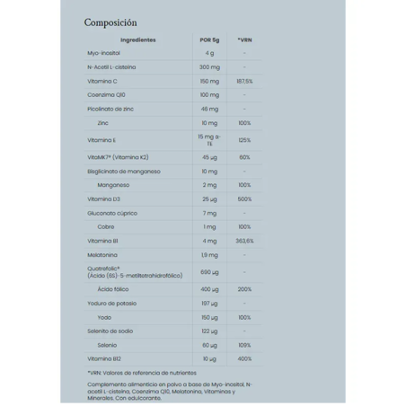 IVB FertiUp Sabor Kiwi, 150 gramos es un complemento alimenticio en polvo diseñado para mujeres que buscan apoyar el equilibrio de la función ovárica y el metabolismo endocrino a través de la nutrición. Su composición se basa en una combinación precisa de myo-inositol y D-chiro-inositol, junto con N-acetilcisteína, zinc y cobre, nutrientes que han sido seleccionados por su papel en procesos biológicos relacionados con la salud reproductiva femenina. El formato en polvo, con un agradable sabor a kiwi, facilita su disolución y permite una ingesta cómoda y adaptable a diferentes rutinas diarias. Este producto está orientado a quienes desean complementar su dieta con ingredientes que participan en la señalización celular, la regulación del estrés oxidativo y el mantenimiento de funciones metabólicas asociadas al ciclo ovárico. La selección de sus componentes responde a la evidencia científica que respalda el papel del inositol y los antioxidantes en la fisiología ovárica, proporcionando así un perfil nutricional que puede resultar de interés para mujeres en edad fértil. IVB FertiUp Sabor Kiwi se presenta como una opción práctica y agradable para quienes buscan cuidar su bienestar reproductivo a través de la alimentación diaria.